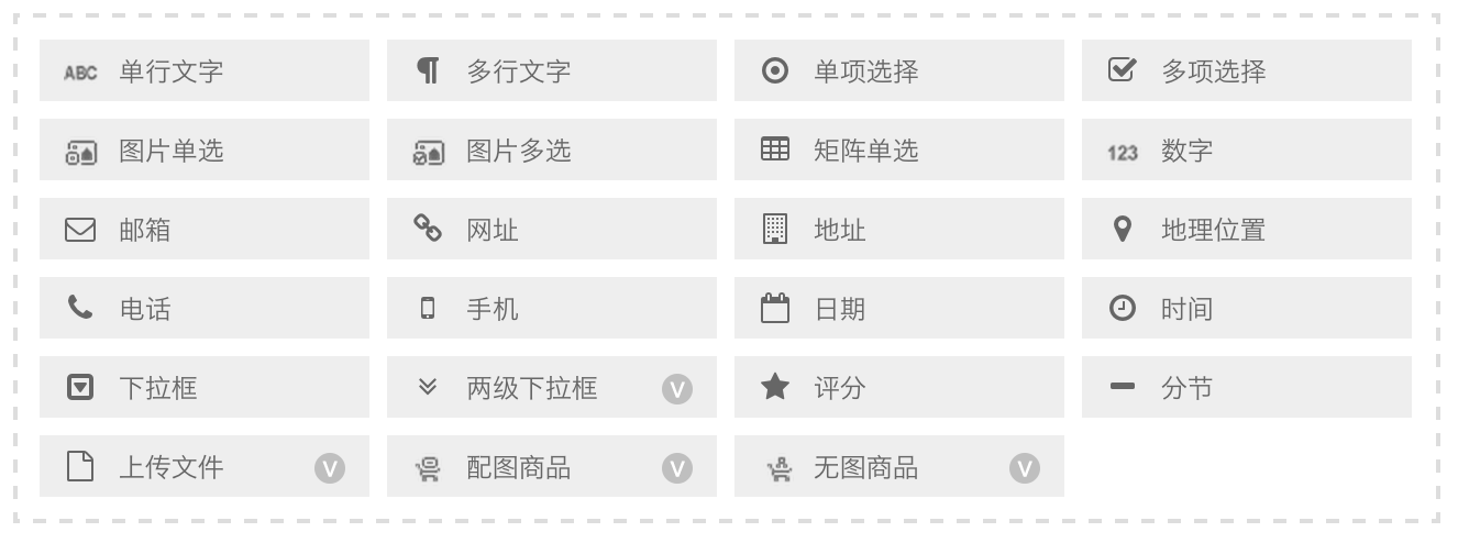 表单是由字段组成的,好的字段搭配可以简化填写步骤,节约填写时间。 目前金数据向您提供了23种字段,您可以在本文中了解各个字段的常见使用场景。